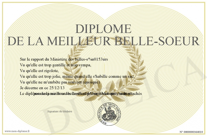 Envoyez par email votre Diplôme de la meilleur belle-soeur personalisé