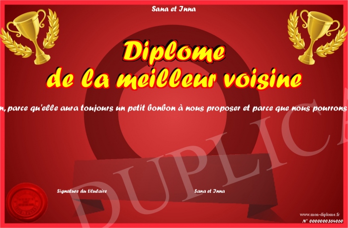 Envoyez par email votre Diplôme de la meilleur voisine personalisé