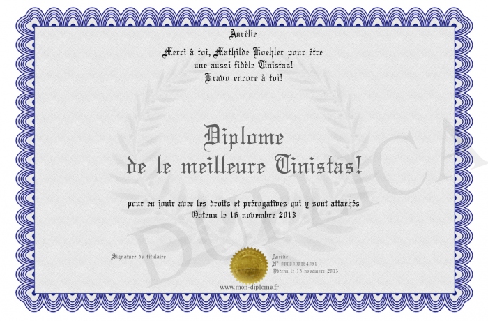 Envoyez par email votre Diplôme de le meilleure Tinistas! personalisé