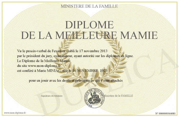 Envoyez par email votre Diplôme de la Meilleure Mamie personalisé