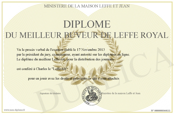 Envoyez par email votre Diplôme du meilleur buveur de Leffe Royal personalisé