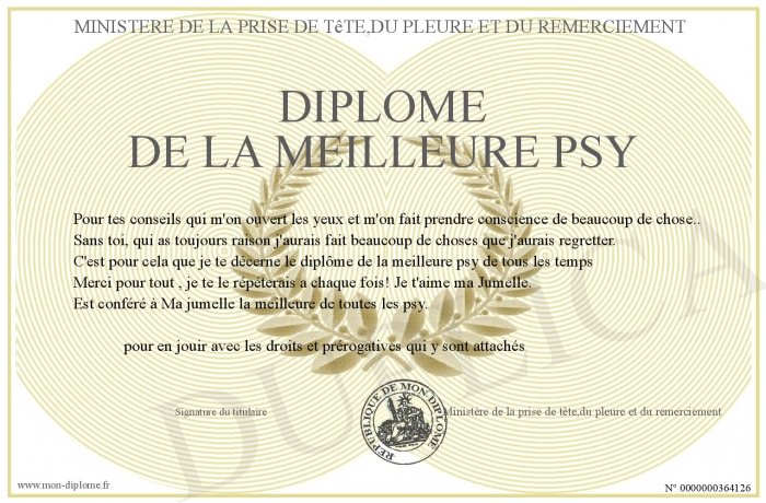 Envoyez par email votre Diplôme de la meilleure psy personalisé