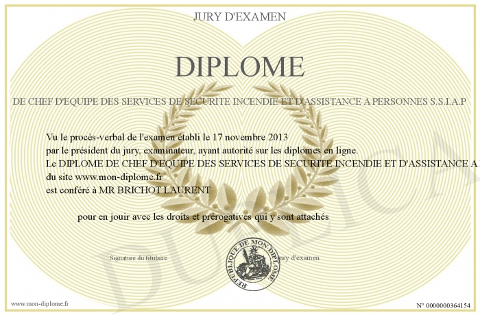 Envoyez par email votre DIPLOME DE CHEF D'EQUIPE DES SERVICES DE SECURITE INCENDIE ET D'ASSISTANCE A PERSONNES S.S.I.A.P personalisé