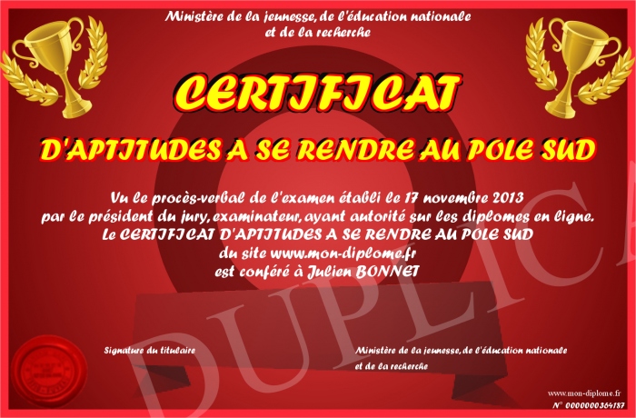 Envoyez par email votre CERTIFICAT D'APTITUDES A SE RENDRE AU POLE SUD personalisé
