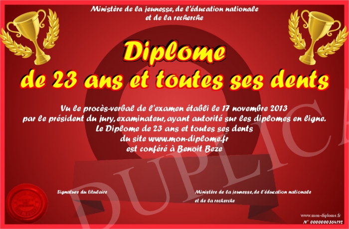 Envoyez par email votre Diplôme de 23 ans et toutes ses dents personalisé