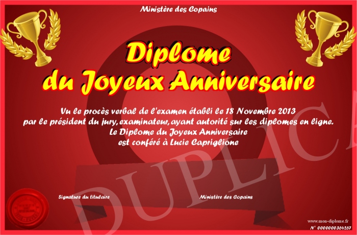 Envoyez par email votre Diplôme du Joyeux Anniversaire personalisé