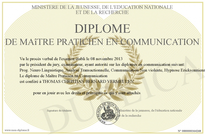 Envoyez par email votre Diplôme de Maître Praticien en Communication personalisé