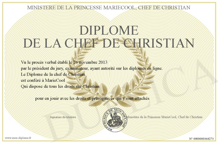 Envoyez par email votre Diplôme de la chef de Christian personalisé