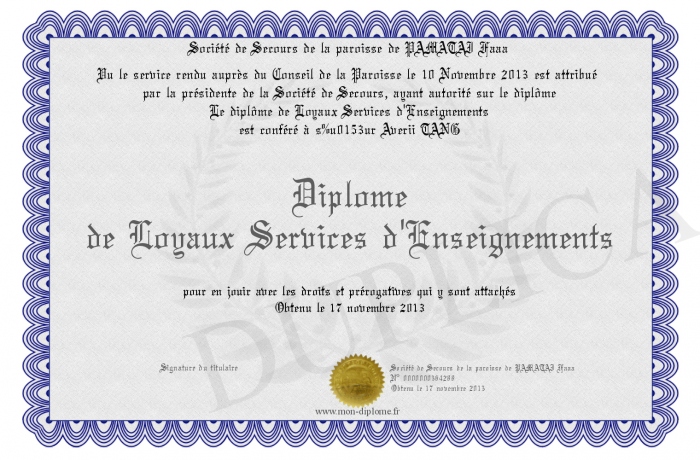 Envoyez par email votre Diplôme de Loyaux Services d'Enseignements personalisé