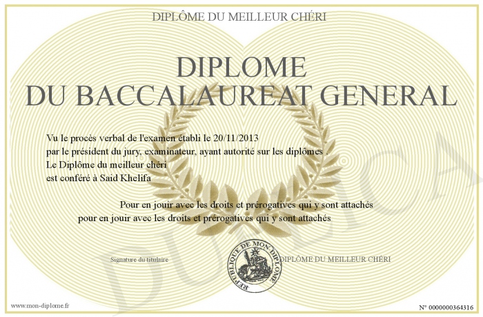 Envoyez par email votre Diplôme du baccalaureat général personalisé