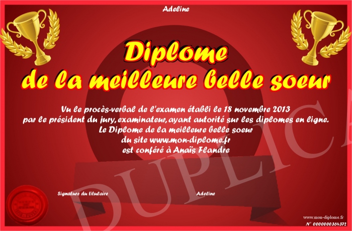 Envoyez par email votre Diplôme de la meilleure belle soeur personalisé