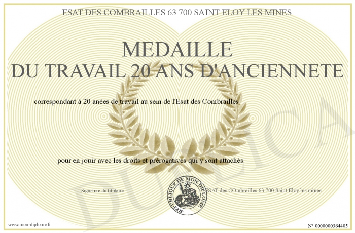 Envoyez par email votre Médaille du travail 20 ans d'ancienneté personalisé