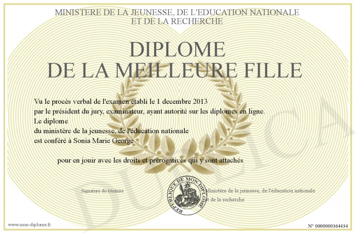 Envoyez par email votre Diplôme de la meilleure fille personalisé
