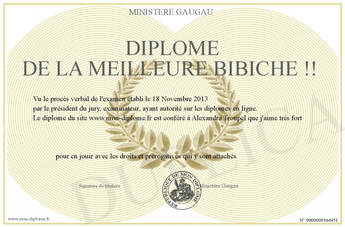 Envoyez par email votre Diplôme de la Meilleure Bibiche !! personalisé