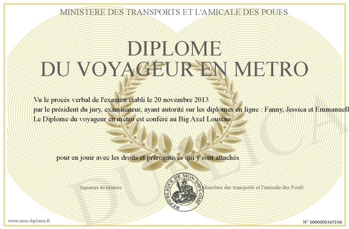 Envoyez par email votre Diplôme du voyageur en métro personalisé