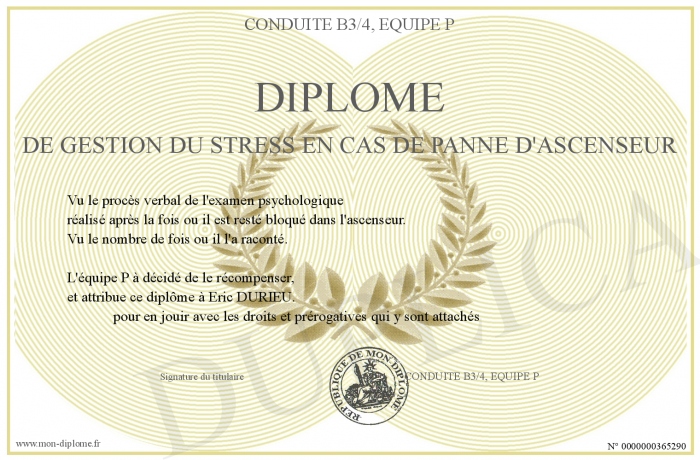 Envoyez par email votre Diplôme de Gestion du Stress en Cas de Panne d'Ascenseur personalisé