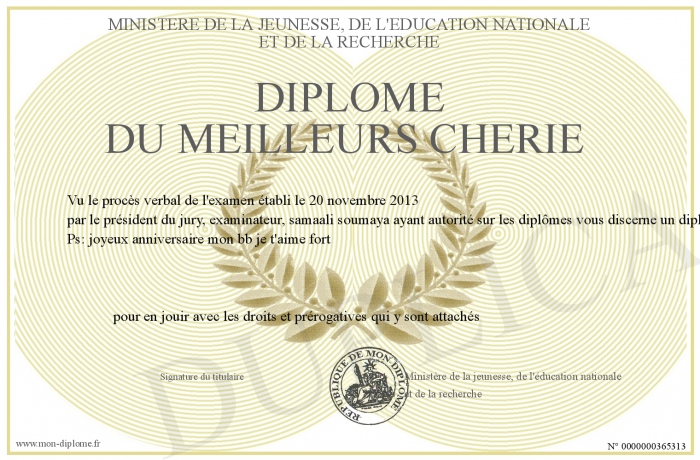 Envoyez par email votre Diplôme du meilleurs chérie personalisé