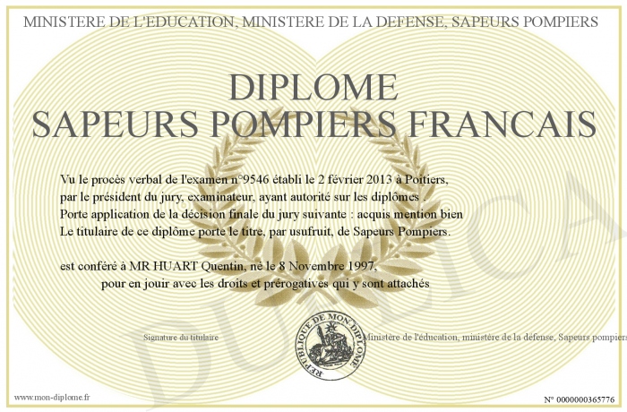 Envoyez par email votre Diplôme Sapeurs Pompiers Francais personalisé