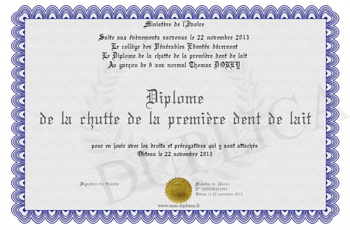Envoyez par email votre Diplôme de la chutte de la première dent de lait personalisé