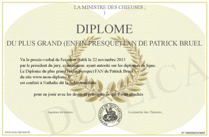 Envoyez par email votre Diplôme du plus grand (enfin presque) FAN de Patrick Bruel personalisé