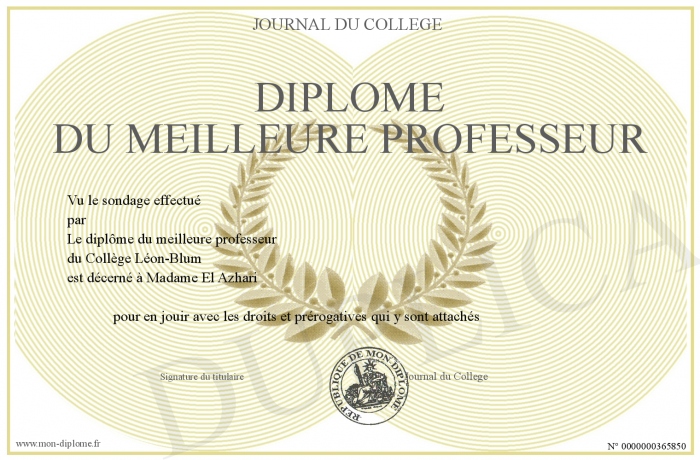 Envoyez par email votre Diplôme du meilleure professeur personalisé