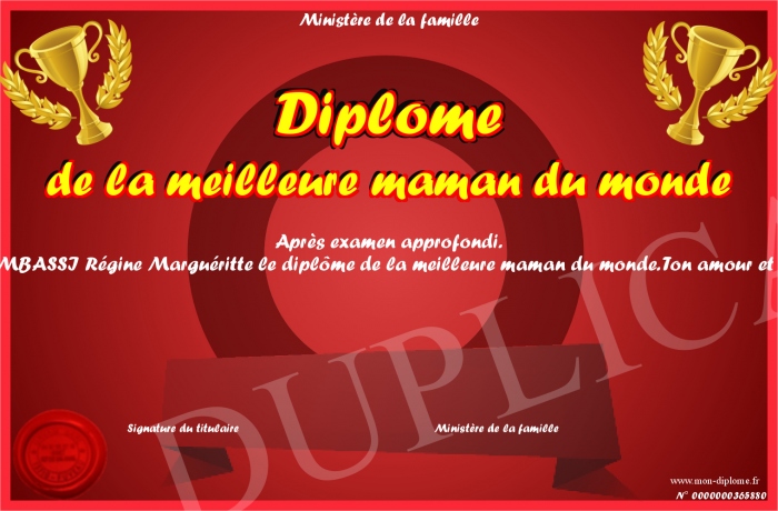 Envoyez par email votre Diplôme de la meilleure maman du monde personalisé