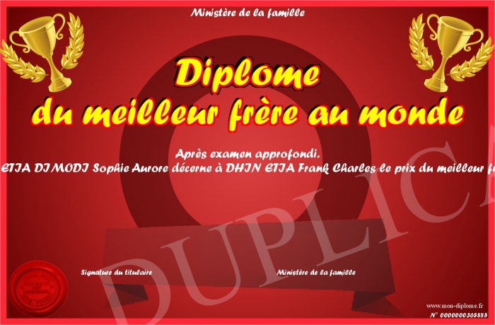 Envoyez par email votre Diplôme du meilleur frère au monde personalisé