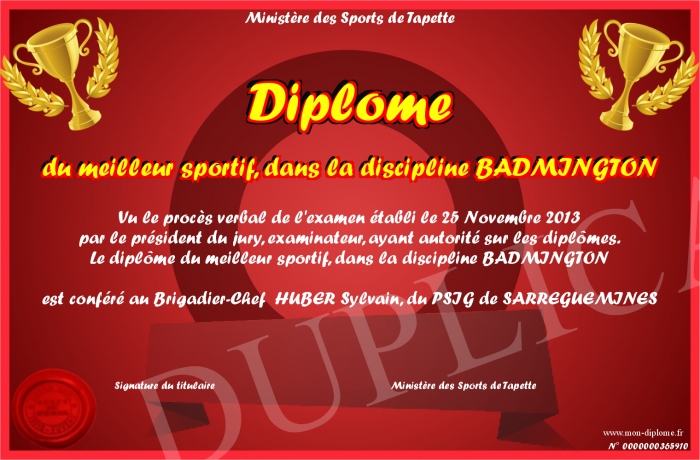 Envoyez par email votre Diplôme du meilleur sportif, dans la discipline BADMINGTON personalisé