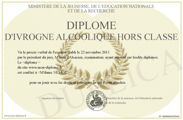 Envoyez par email votre diplôme d'ivrogne alcoolique hors classe personalisé