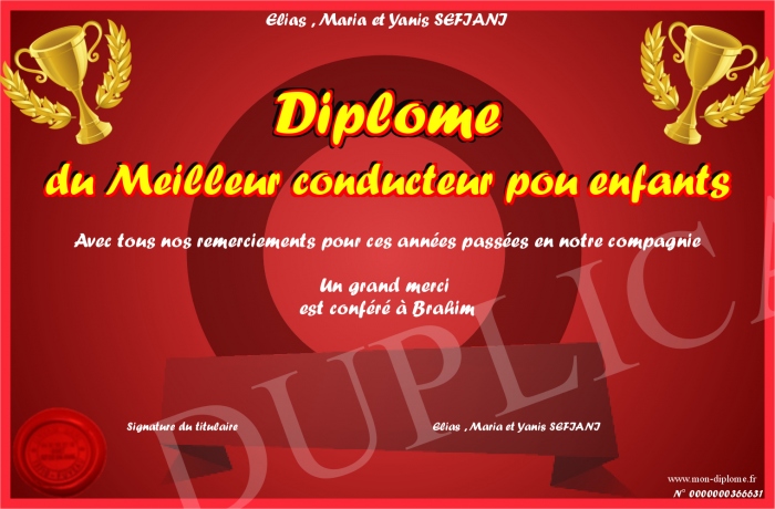 Envoyez par email votre Diplôme du Meilleur conducteur pou enfants personalisé