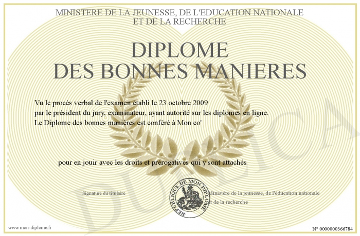 Envoyez par email votre Diplôme des bonnes manières personalisé