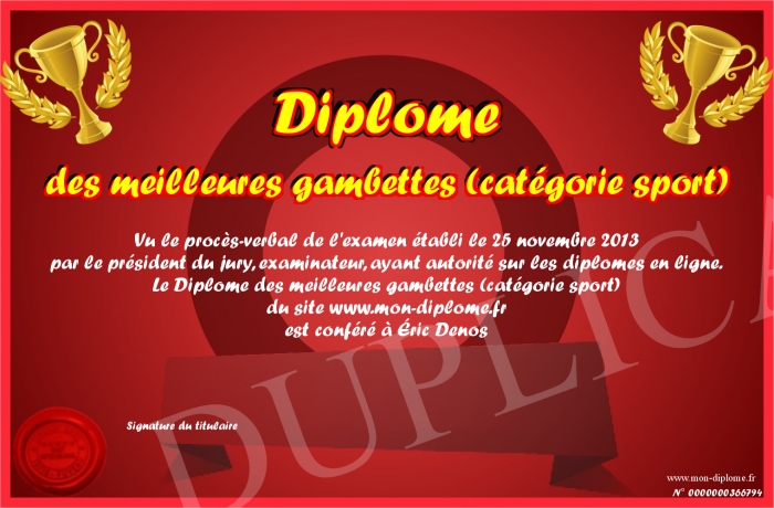 Envoyez par email votre Diplôme des meilleures gambettes (catégorie sport) personalisé