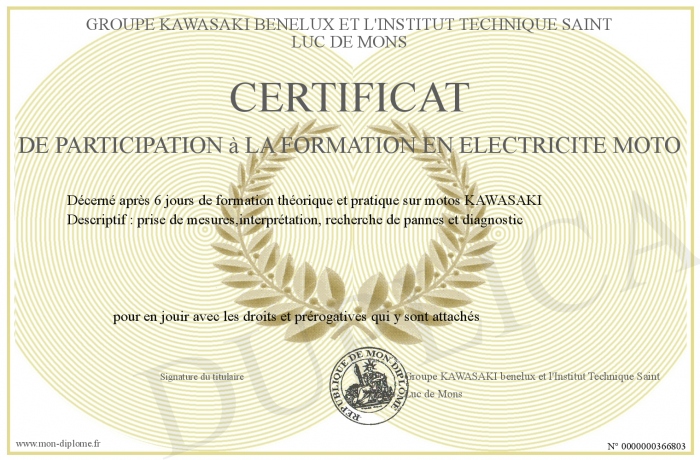 Envoyez par email votre Certificat de participation à la formation en électricité moto personalisé