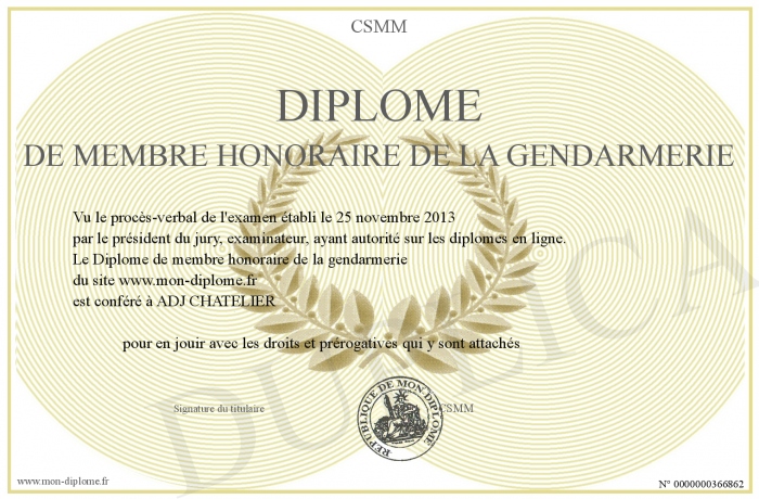 Envoyez par email votre Diplôme de membre honoraire de la gendarmerie personalisé