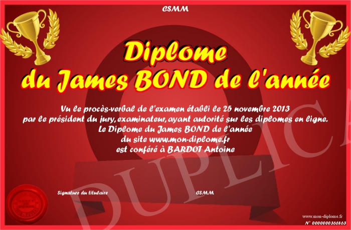 Envoyez par email votre Diplôme du James BOND de l'année personalisé