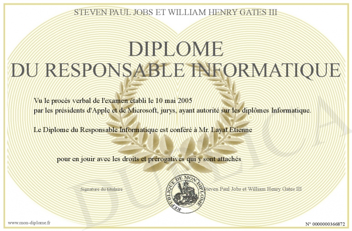 Envoyez par email votre Diplôme du Responsable Informatique personalisé