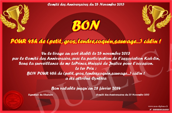 Envoyez par email votre BON POUR 48h de (petit, gros, tendre,coquin,sauvage...) câlin ! personalisé