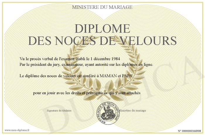 Envoyez par email votre Diplôme des noces de velours personalisé