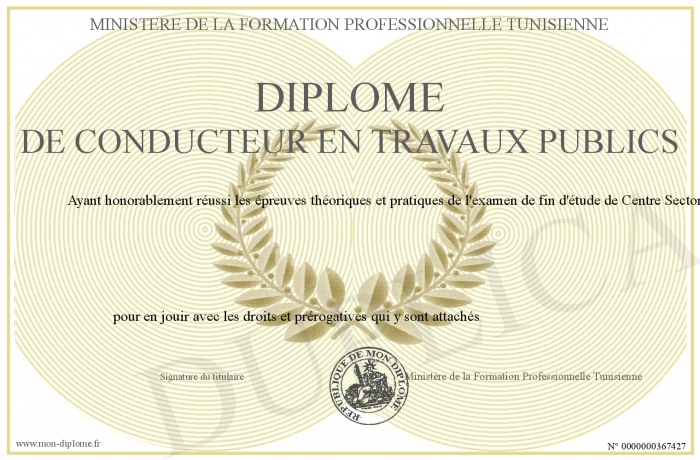 Envoyez par email votre Diplôme de Conducteur en Travaux Publics personalisé