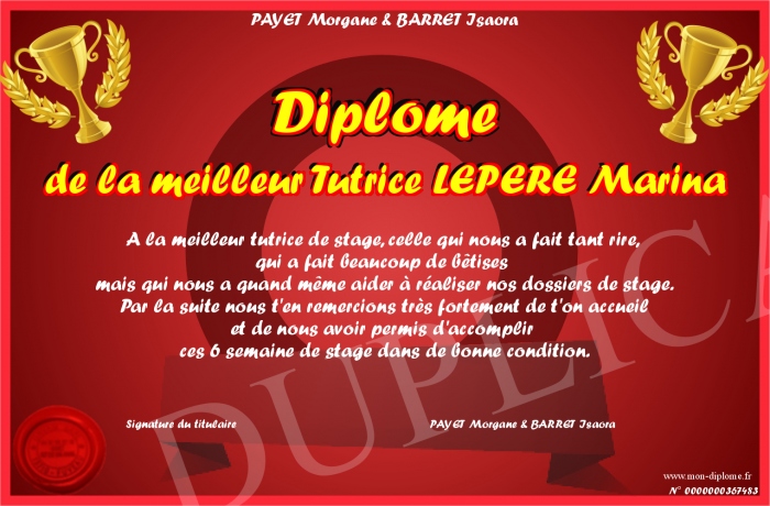 Envoyez par email votre Diplôme de la meilleur Tutrice LEPERE Marina personalisé