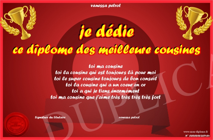 Envoyez par email votre je dédie ce dîplome des meilleure cousines personalisé