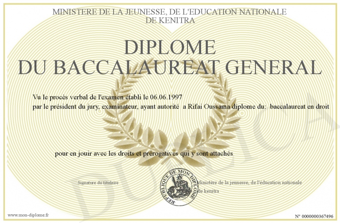 Envoyez par email votre Diplôme du baccalaureat général personalisé