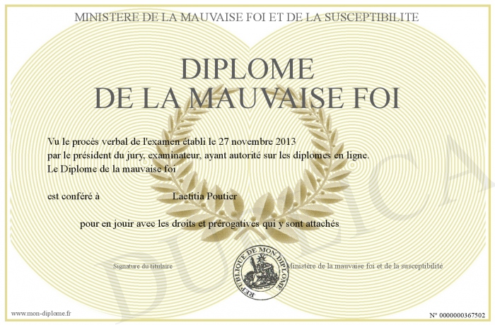 Envoyez par email votre Diplôme de la mauvaise foi personalisé