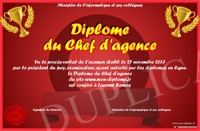 Envoyez par email votre Diplôme du Chef d'agence personalisé