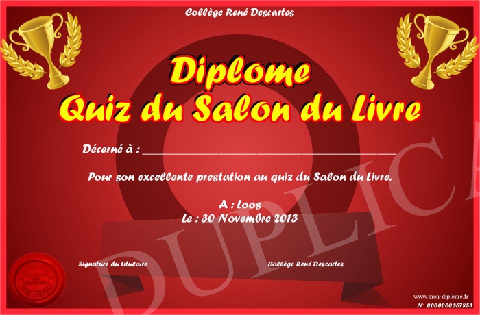 Envoyez par email votre Diplôme Quiz du Salon du Livre personalisé