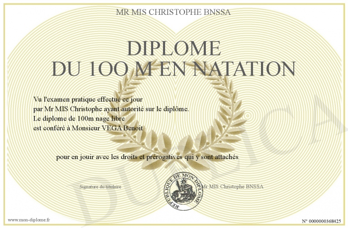 Envoyez par email votre Diplôme du 1OO m en Natation personalisé