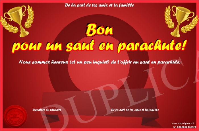 Envoyez par email votre Bon pour un saut en parachute! personalisé
