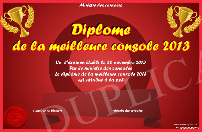 Envoyez par email votre Diplôme de la meilleure console 2013 personalisé
