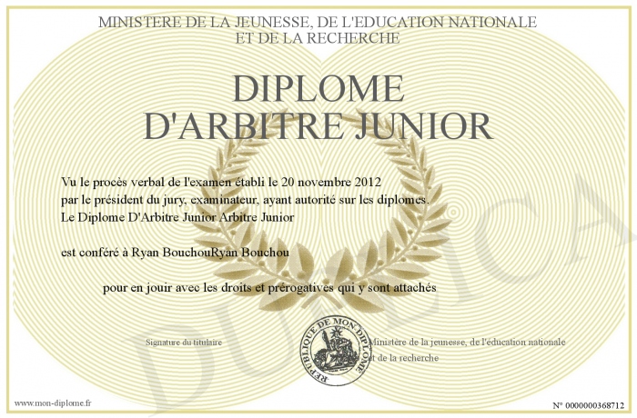 Envoyez par email votre Diplome D'Arbitre Junior personalisé
