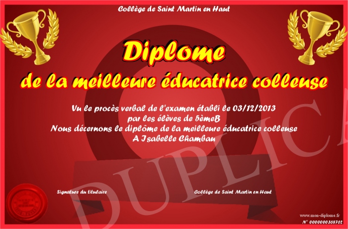 Envoyez par email votre Diplôme de la meilleure éducatrice colleuse personalisé